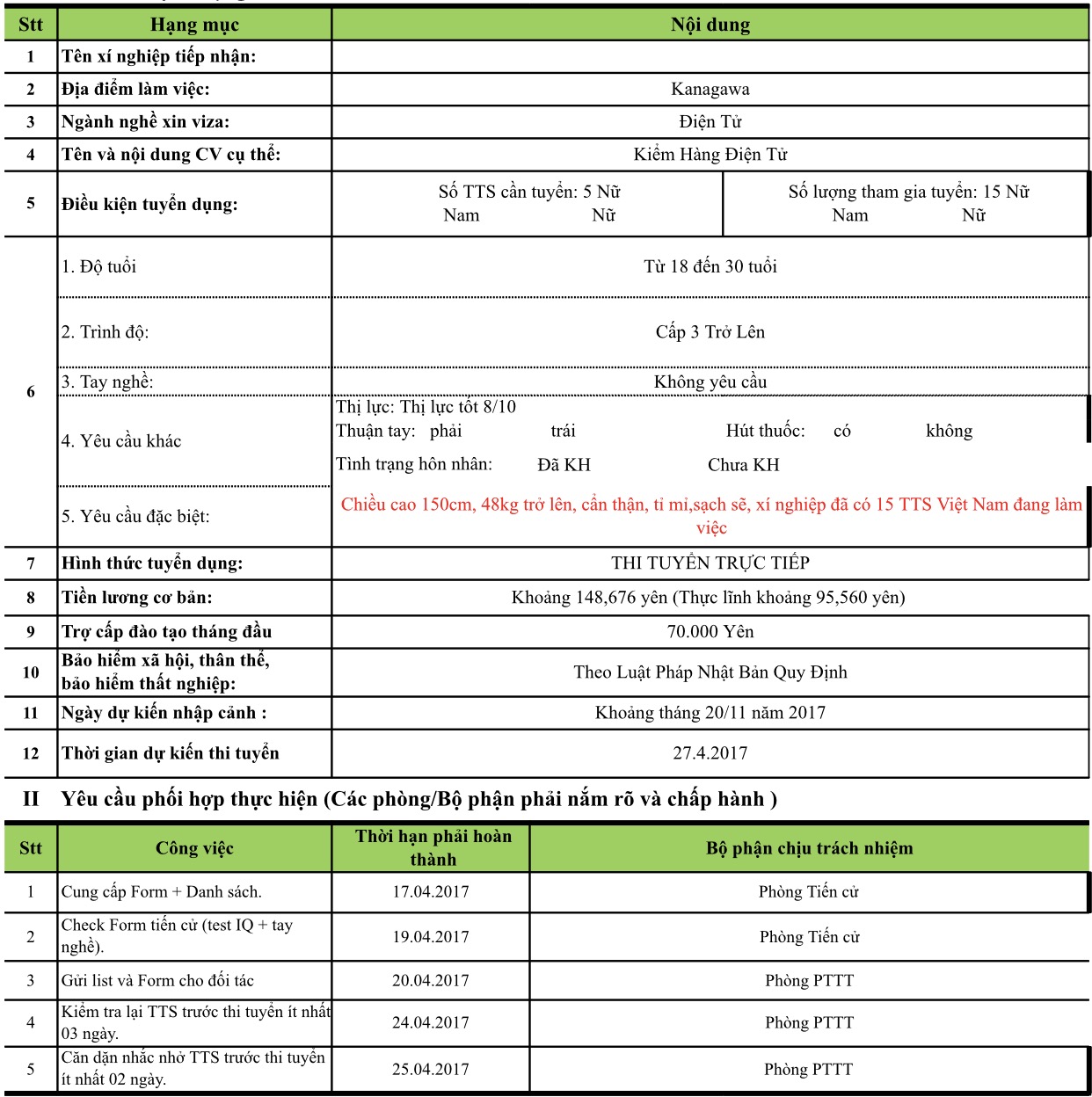 NỘI DUNG ĐƠN HÀNG Số lượng lao động tiếp nhận: 10 Nam, nữ Công việc cụ thể: Lắp ráp linh kiện điện tử Thời gian hợp đồng của người lao động: 3...