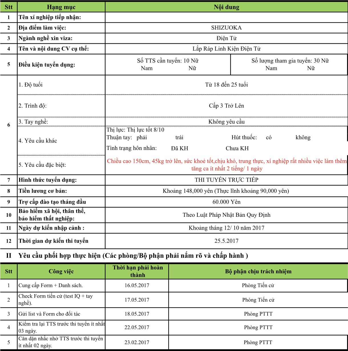 NỘI DUNG ĐƠN HÀNG Số lượng lao động tiếp nhận: 10 Nam, nữ Công việc cụ thể: Lắp ráp linh kiện điện tử Thời gian hợp đồng của người lao động: 3...